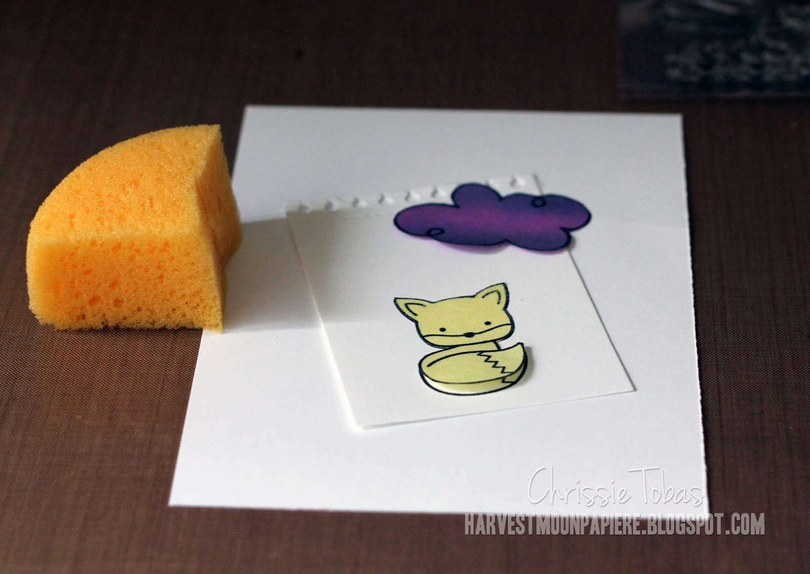 To create the clouds, I usually go right to left, but you can do whatever works for you! I simply place the cloud down and then sponge around the top of it. I usually test out the color and the sponge off to the side so the ink isn't too dark (Broken China Distress Ink was used for this project).